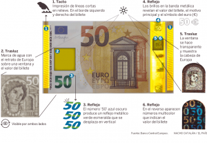Este holograma a dos caras es uno de los últimos avances tecnológicos en billetes, que hace sea aún más difícil su posible falsificación. Otra de las novedades la encontramos en el número 50 que aparece en verde esmeralda en la zona inferior del billete y que ahora tiene la capacidad de cambiar de color, pasando a un azul oscuro al inclinarlo.