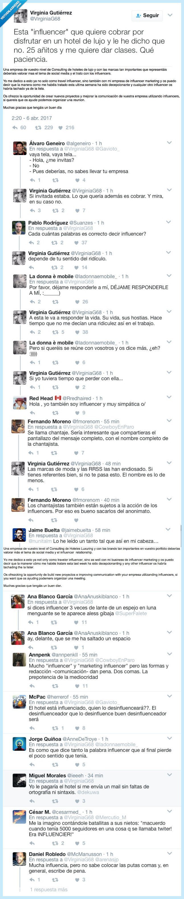 A ver, el tema influencer. Que si lo eres perfecto, pero que no todo vale. Esta chica cuelga en Twitter la respuesta de una «influencer» que quería cobrar por ir de vacaciones a un hotel de lujo de su compañía. La reacción de los tuiteros no se hace esperar.
