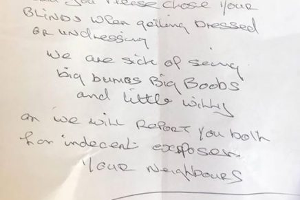 Parece ser que una familia le escribió una nota a un matrimonio que van ligeros de ropa en su propia vivienda, para ver si podían, al menos, subir las persianas ya que están hartos de verles pasear en calzoncillos o bragas.