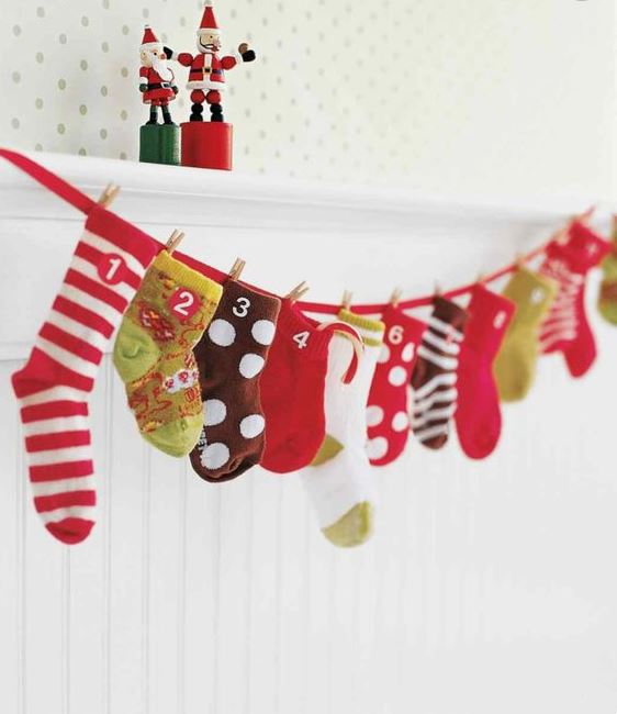 Otros recursos serían los propios calcetines de nuestros pequeños. ¡Mira qué bonitos quedan colgados! Además, seguro que les encantará buscar en ellos el regalo del día.