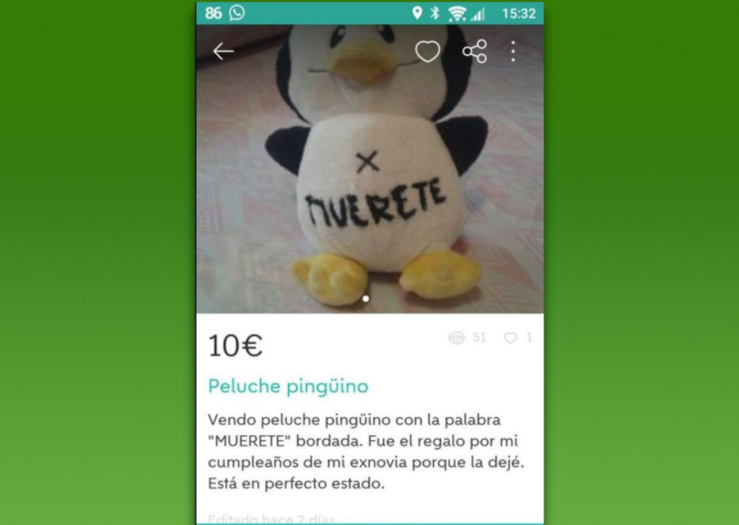 El primero de ellos es un pingüino de peluche por diez euros. A simple vista, no localizamos nada extraño hasta que nuestra compañera nos muestra la imagen: El muñeco tiene bordada la palabra «muérete«. Al parecer, fue el regalo de la exnovia a este hombre nada más dejarla.