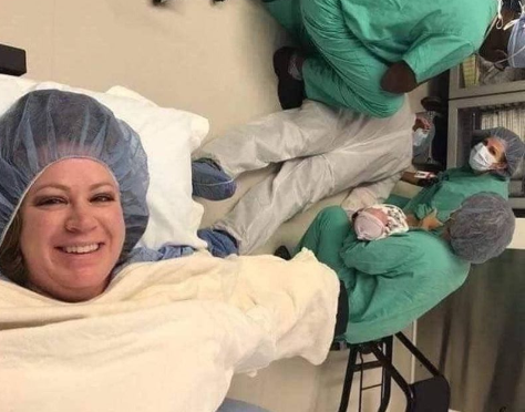 La imagen refleja lo bien que se encuentra ella y lo «emocionado» que estaba él nada más ver a su nuevo hijo. De hecho, es curioso ver cómo los médicos dejan de prestar atención a la paciente para atender al pobre hombre.