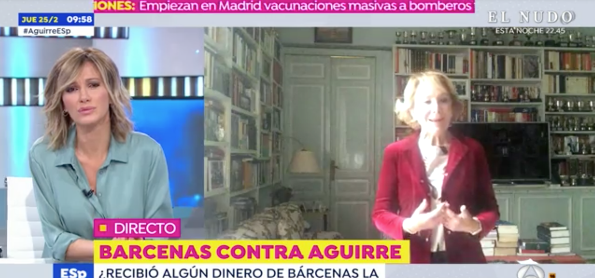 Por alusiones, Esperanza Aguirre ha intervenido en diferentes medios para dar su versión de los hechos. Sus palabras han generado expectación entre los espectadores, pero no ha sido el único detalle en el que estos se han fijado. A las redes sociales no se les escapa detalle y sonado ha sido el espacio que la política eligió para realizar la conexión con Espejo Público la mañana del jueves.