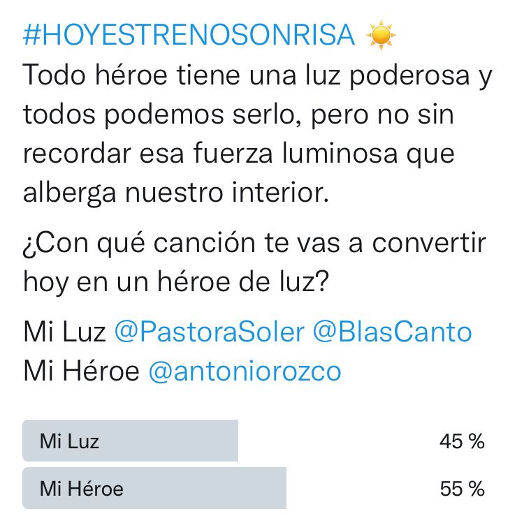 A partir de ahora, tú serás quien decida con qué canción estrenamos sonrisa cada día. En nuestras redes batiremos en duelo a dos temas destacados entre los que tendrás que decidir. El ganador será la canción con la que nos despertaremos enérgicos y sonrientes al día siguiente.