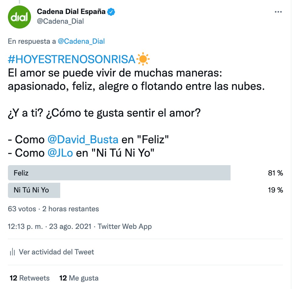 A partir de ahora, tú serás quien decida con qué canción estrenamos sonrisa cada día. En nuestras redes batiremos en duelo a dos temas destacados entre los que tendrás que decidir. El ganador será la canción con la que nos despertaremos enérgicos y sonrientes al día siguiente.