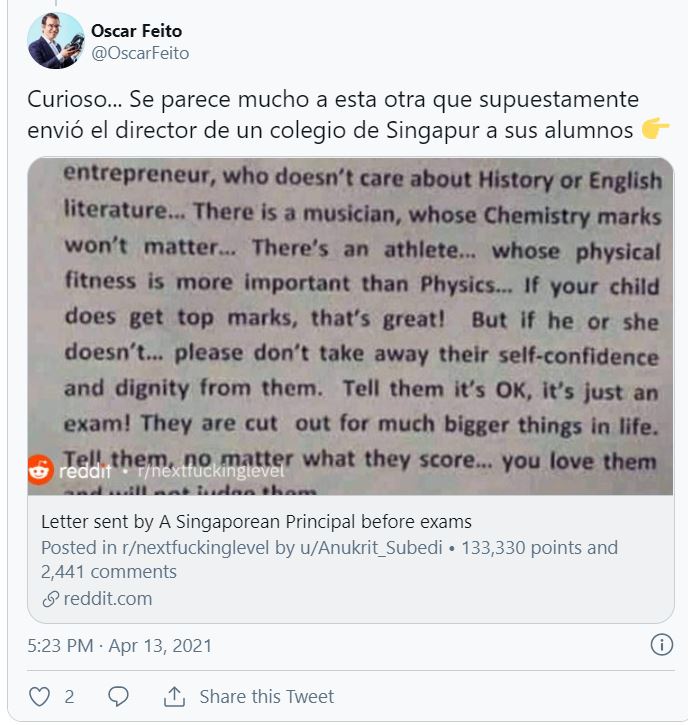 La carta, en realidad, está inspirada en una misiva que un profesor de Singapur mandó en 2017 y que se ha aprovechado para traducir a nuestra lengua.