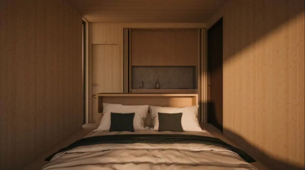 La casa prefabricada tiene 30 metros cuadrados y se puede instalar prácticamente en cualquier lugar causando un impacto mínimo en el entorno. Cuenta con un salón, cocina y baño. El acabado interior puede ser CLT o blanco, con muebles en madera clara que sirven para ahorrar energía, ofrecer una sensación de luminosidad y calidez en el hogar.