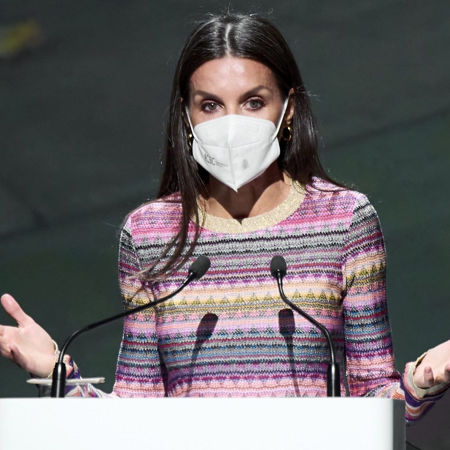 Ha protagonizado el acto llamando la atención de la prensa, ya que ha asistido con un vestido muy colorido poco propio a lo que nos tiene acostumbrados.