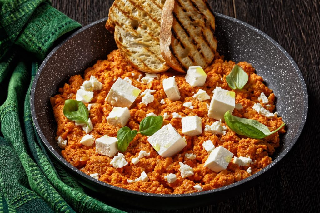 Probablemente sea uno de los revueltos de huevo más exquisitos del mundo, las especias le aportan un montón de aromas y sabores y el toque de queso feta lo hace algo más sofisticado que un revuelto normal. Se toma con un poco de pan tostado y el resultado es espectacular.