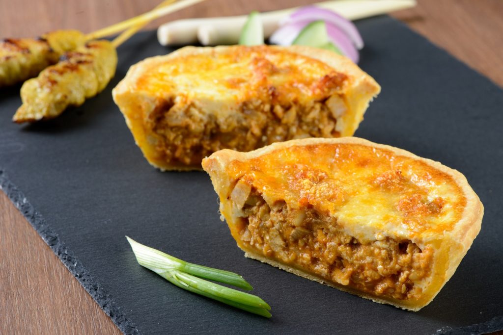 Extiende el hojaldre y córtalo en cuatro porciones, pinta con aceite cuatro moldes individuales de cerámica y llénalos con la mezcla, cubre con el hojaldre pegando muy bien los bordes al molde.