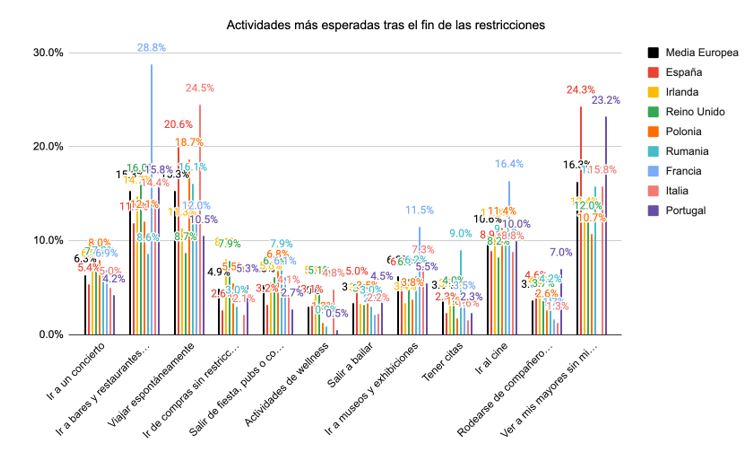 Según los datos de la encuesta, y a pesar de que el 60% de los españoles (al igual que el 65% de los portugueses y el 41% de los polacos) valoren más besar y abrazar a sus seres queridos, lo que más felices hace a los europeos en comparación a antes de la pandemia es salir a pasear. Concretamente, el 51% de los franceses y españoles, el 48% de los ingleses e irlandeses, y el 44% de los italianos señalan que son más felices dando un paseo o yendo a caminar ahora que antes. Organizar comidas familiares o con amigos es otra de las actividades más valoradas, sobre todo en Portugal (62,2%), Rumanía (48,8%) e Irlanda (48,2%).