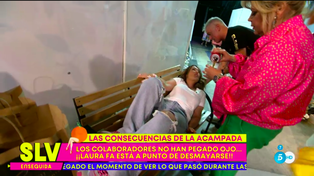 Sin descanso y con las altas temperaturas, Laura Fa sufre un desmayo en pleno directo que dejó a todos muy preocupados. Al verla en este estado María Patiño saltó: «Hay que llamar al servicio médico». Cuando la presentadora le preguntó a Laura que le pasaba ella contestó: «No, no, que estoy un poco mareada. Me salgo a beber algo. Necesito algo con cafeína». «Esta amarilla» advertía Patiño y Terelu Campos añadía: «Es que ahora mismo aquí hace un calor…»