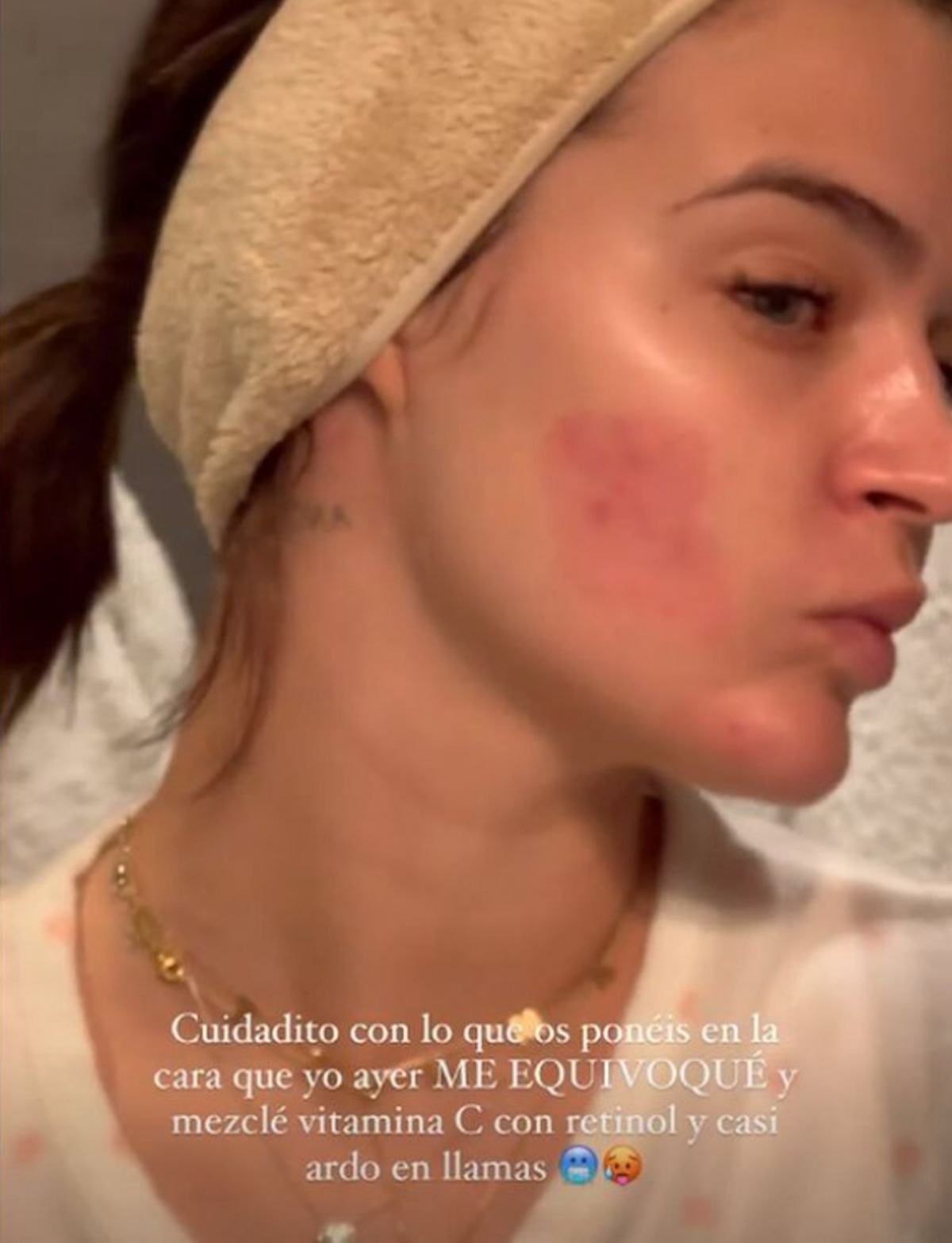 «Cuidadito con lo que os ponéis en la cara que yo ayer me equivoqué y mezclé vitamina C con Retinol y casi ardo en llamas», publicaba la catalana junto a una imagen en la que se aprecia una ligera quemadura en su rostro.
