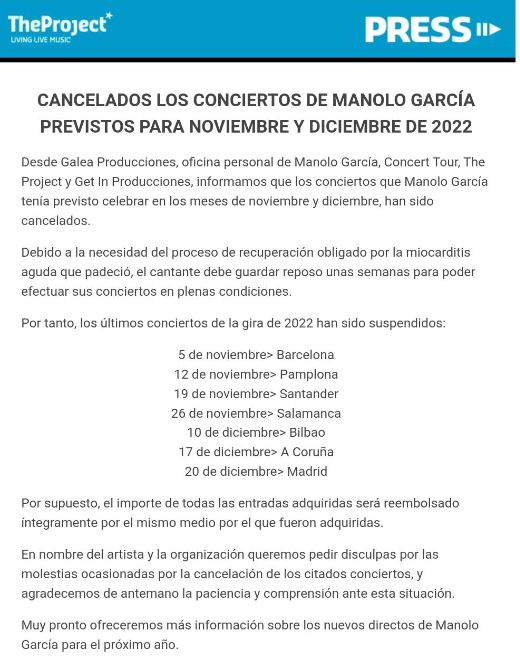 El importe será reembolsado íntegramente por el mismo medio por el que fueron adquiridas.#ManoloGarcía pic.twitter.com/tCk2nu4r9v