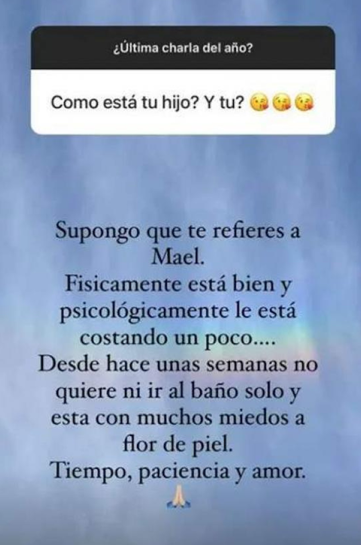 «Físicamente está bien y psicológicamente le está costando un poco… Desde hace algunas semanas no quiere ni ir al baño solo y está con muchos miedos a flor de piel. Tiempo, paciencia y amor».