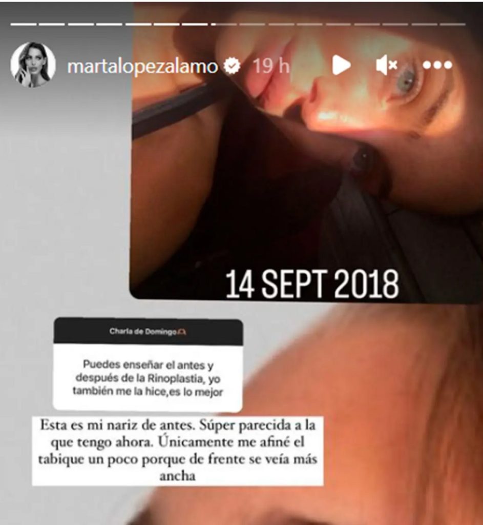 López Álamo subía a sus stories dos fotos hechas el 14 de septiembre de 2018, «Esta es mi nariz de antes. Súper parecida a la que tengo ahora. Únicamente me afiné el tabique un poco porque de frente se veía más ancha», explicaba. Tras subirla, algunos no tardaban en dar su opinión y no precisamente favorable y amable. Marta se ha explicado, visiblemente enfadada.