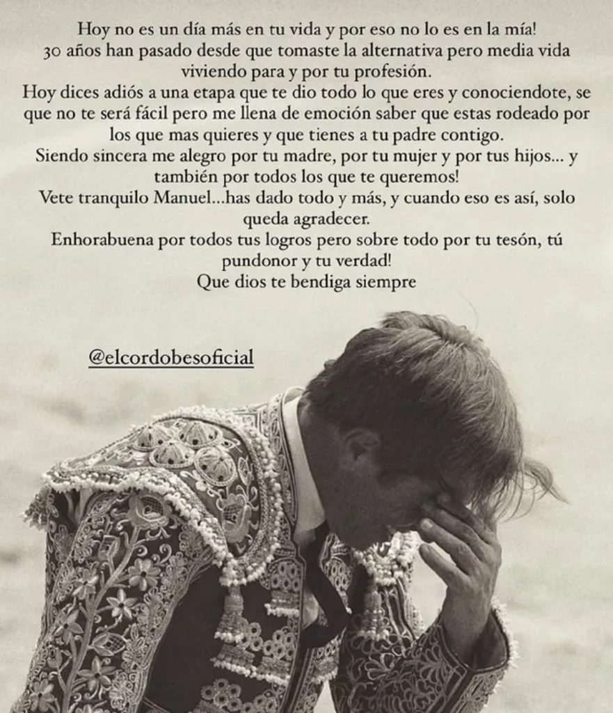 Lo ha hecho a través de su cuenta de Instagram dónde junto a una foto de Díaz vestido de torero ha escrito, «Hoy no es un día más en tu vida y por eso no lo es en la mía. 30 años han pasado desde que tomaste la alternativa pero media viviendo por y para tu profesión», y continuaba «Hoy dices adiós a una etapa que te dio todo lo que eres y, conociéndote, sé que no será fácil pero me llena de emoción saber que estás rodeado por lo que más quieres y que tienes a tu padre contigo», explican desde Divinity.