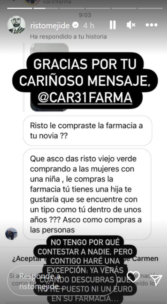 «Gracias por tu cariñoso mensaje«, respondía este irónico. «No tengo por qué contestar a nadie, pero contigo haré una excepción. Ya verás cuando descubras que no he puesto ni un euro en su farmacia«, continuaba diciendo en la misma historia de Instagram.