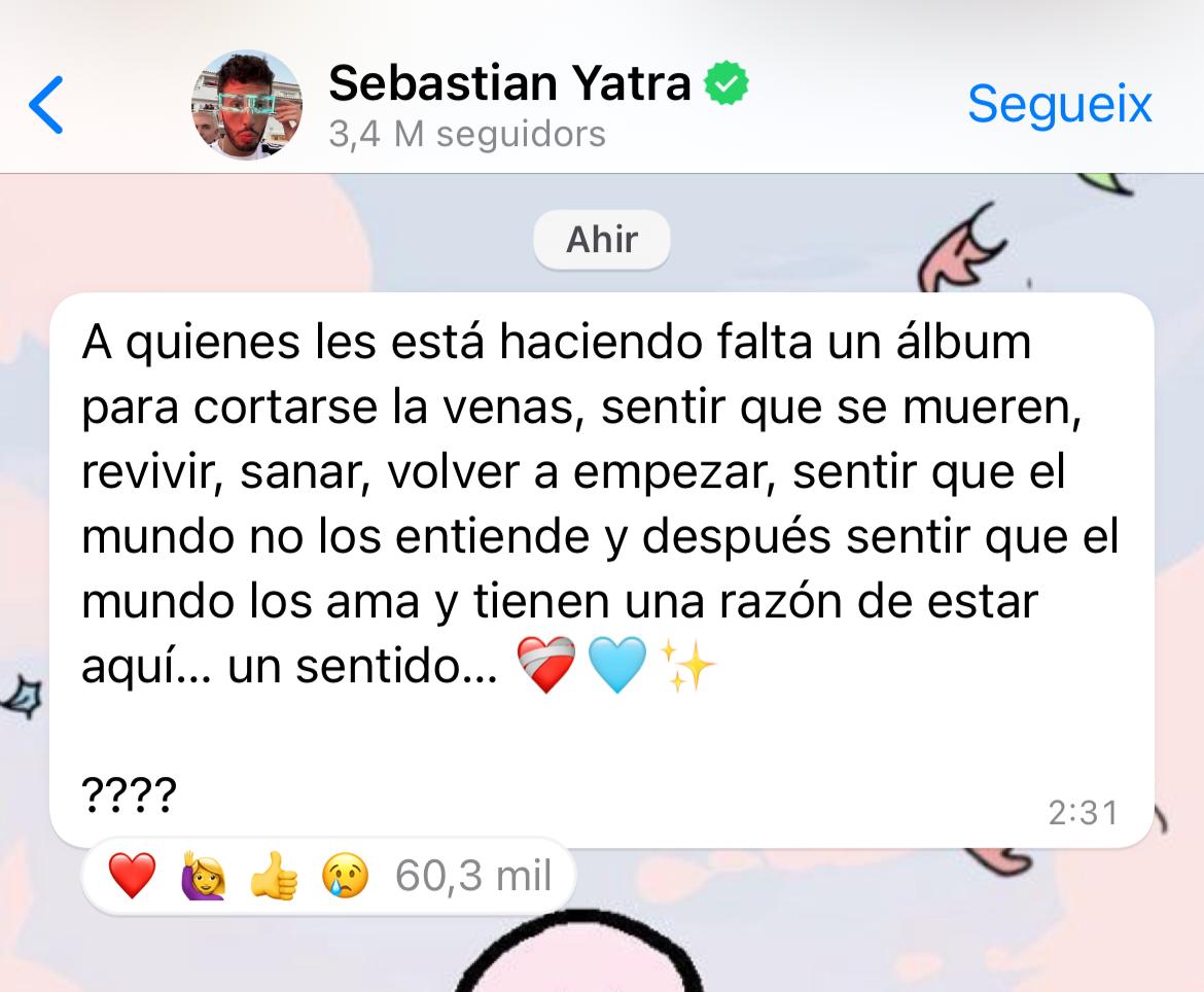 Y es que su último mensaje no ha hecho más que aumentar las expectativas. «¿A quiénes les está haciendo falta un álbum para cortarse las venas, sentir que se mueren, revivir, sanar, volver a empezar, sentir que el mundo no los entiende y después sentir que el mundo los ama y tienen una razón de estar aquí?», decía Sebastián en su chat. Sabiendo la historia que te hemos contado al principio y conectándolo con este mensaje, queda más que claro de qué va a hablar el artista en sus próximas composiciones, ¿verdad?