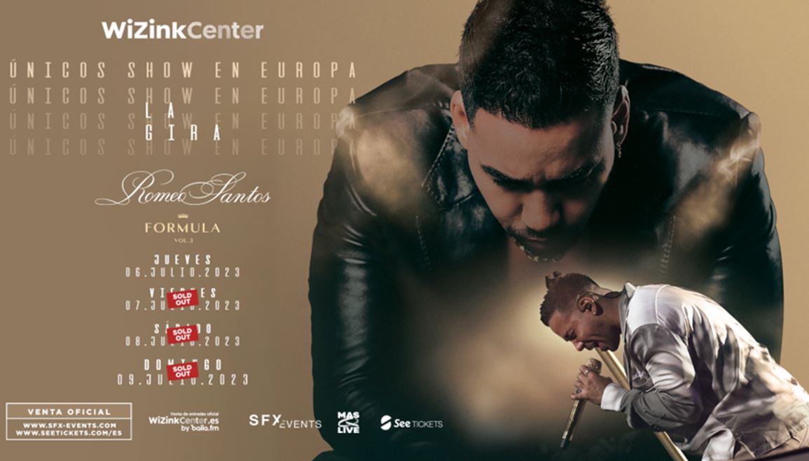 Romeo Santos llegará la primera semana de Julio a Wizink Center de Madrid batiendo un récord histórico de venta consiguiendo colgar el cartel de SOLD OUT a las pocas horas de estar disponibles las entradas de sus 3 primeras fechas y anuncia una 4ª para el jueves 6 de Julio.