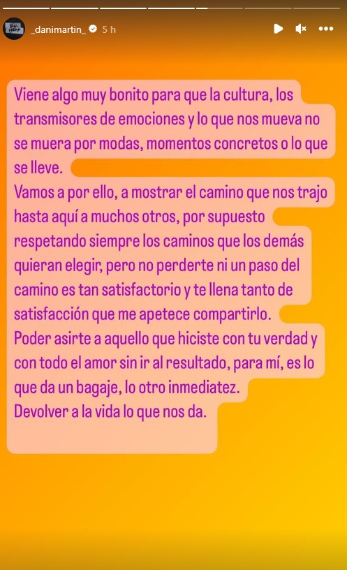 El intérprete ha reaparecido en redes y tiene mucho que decir. A través de sus historias de Instagram, Dani ha querido mostrarse agradecido por todas las cosas buenas que le ha dado la vida, aunque «me haya quitado también«. «No se porqué, pero hasta de lo peor he aprendido y sacado cosas positivas«, ha comenzado sincerándose.
