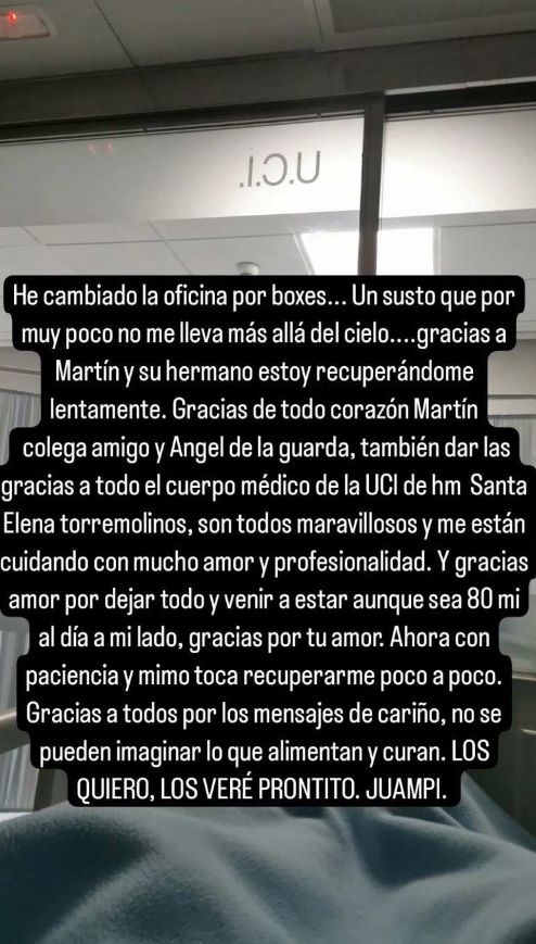 «Gracias de todo corazón Martín, colega, amigo y ángel de la guarda. También a todo el equipo médico de la UCI de hm Santa Elena Torremolinos…son todos maravillosos y me están cuidando con mucho amor y profesionalidad» y también se dirigía a su pareja: «Gracias amor por dejar todo y venir a estar, aunque sea 80 mil al día a mi lado..Gracias por tu amor».