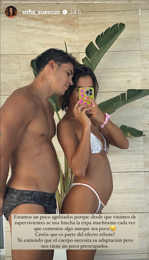 En sus historias de Instagram, la influencer publicó una fotografía en la que se les ve con una notable hinchazón, algo que les tiene intranquilos. Sofía lo explicó con estas palabras: «Estamos un poco agobiados porque desde que regresamos se nos hincha la tripa muchísimo cada vez que comemos algo, aunque sea en poca cantidad. ¿Pensáis que puede ser parte del efecto rebote? Yo entiendo que el cuerpo necesita adaptarse, pero nos tiene un poco preocupados», escribió Suescun junto a la imagen.
