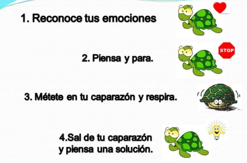 El siguiente paso sería aconsejar al niño que se retire emocionalmente de la situación. Para ello debe imaginar que entra en su caparazón, como si fuera una tortuga, mientras respira. Esto le ayudará a calmar la mente y a usar la respiración consciente como herramienta para manejar el estrés.
