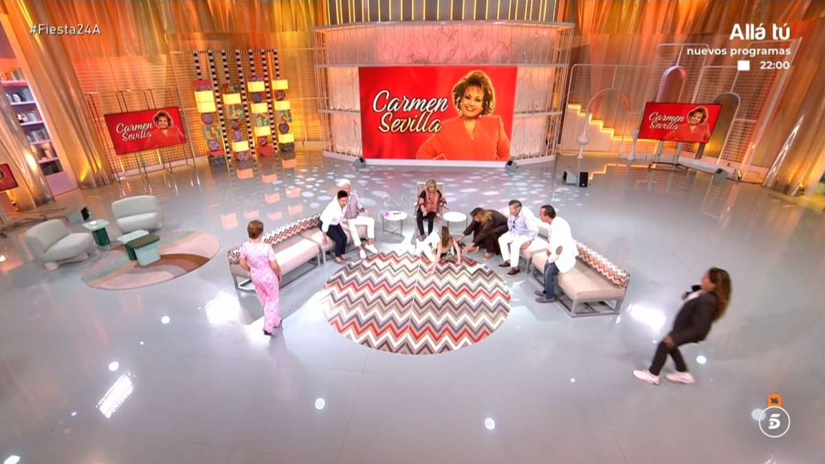 Álex Blanquer le dijo a Terelu: «Pero Terelu, que tienes los tacones aquí«. A lo que ella respondía: «Ahh que me los habíais escondido vosotros«. Para finalmente aclarar lo que estaba sucediendo: «A ver, esto es un guiño a la gran artista de la que vamos a hablar hoy en ‘Aires de fiesta’. Vamos a recordar a una de las artistas más queridas de nuestro país, Carmen Sevilla. Vamos a repasar su vida, su carrera y su triste pérdida hace dos años marcada por la discreción y la polémica por el destino de sus cenizas«.
