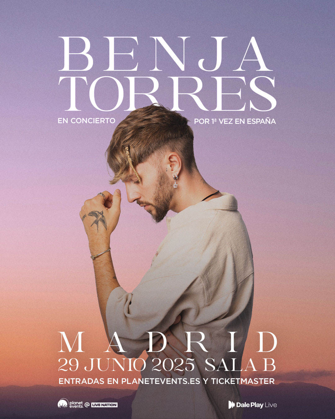 Benja Torres desembarca en España para compartir un proyecto que busca emocionar y conectar desde lo más profundo. Las entradas para el concierto se pondrán a la venta este viernes 6 de junio a las 12:00h en planetevents.es y Ticketmaster; no obstante, habrá una preventa de SMusic este miércoles 4 de junio a las 12:00h y otra para los usuarios registrados en planetevents.es este jueves 5 a las 12:00h.